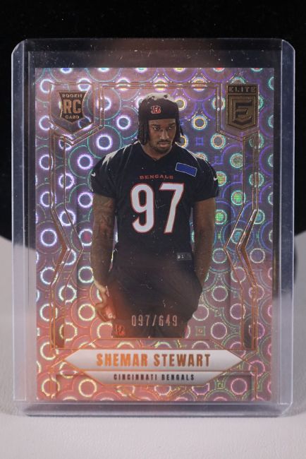 A 2025 Panini Elite rookie card of Bengals star Shemar Stewart. Serial numbered 97/649. Near mint or better condition.