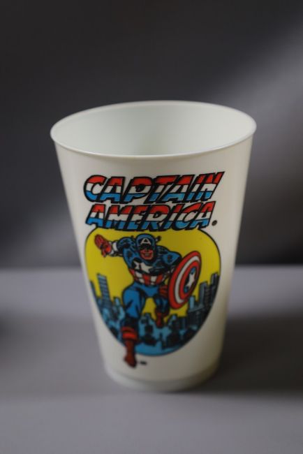 A 1975 VINTAGE MARVEL CAPTAIN AMERICA PLASTIC CUP. VERY GOOD CONDITION.